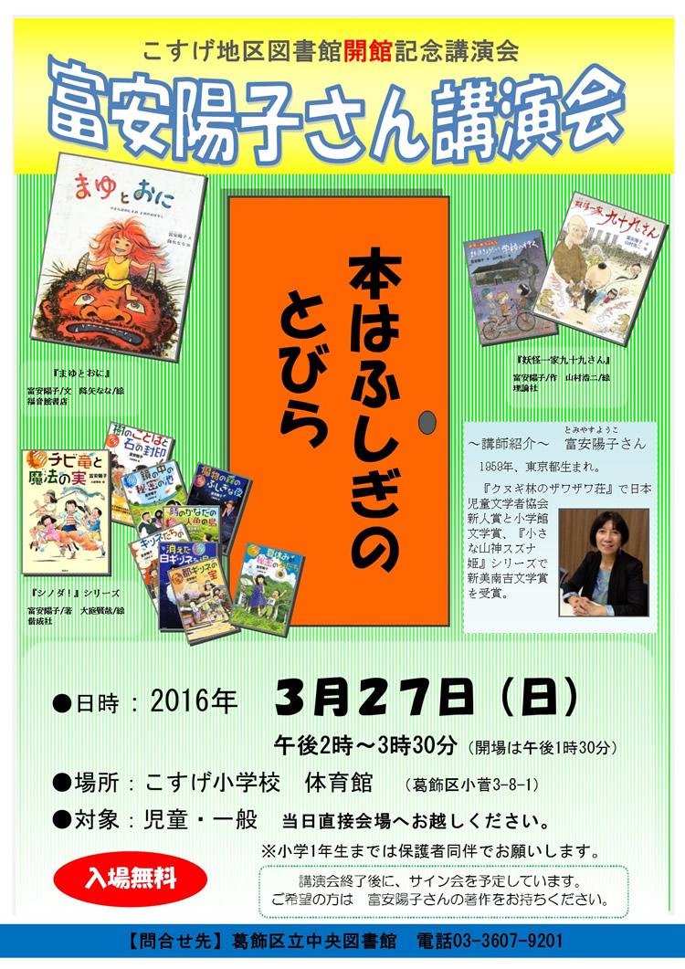 イベント&ニュース - こすげ地区図書館 開館記念講演会「本はふしぎのとびら」