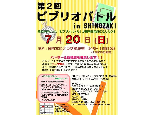 7月20日(日)に「第2回 ビブリオバトル in SHINOZAKI」を開催します。
